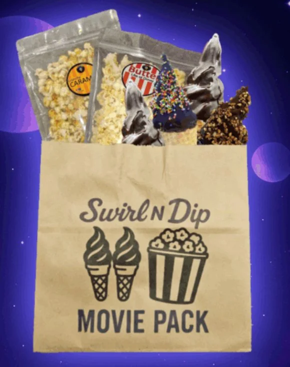 Lights… camera… SNACKS! Its time to bring the cinema snack bar to you! Our Movie Packs are loaded with all the goodies you need for the perfect night in – creamy soft serve and freshly made popcorn! Add some fluffy fairy floss, sherbet and a sprinkle of Swirl N Dip magic.